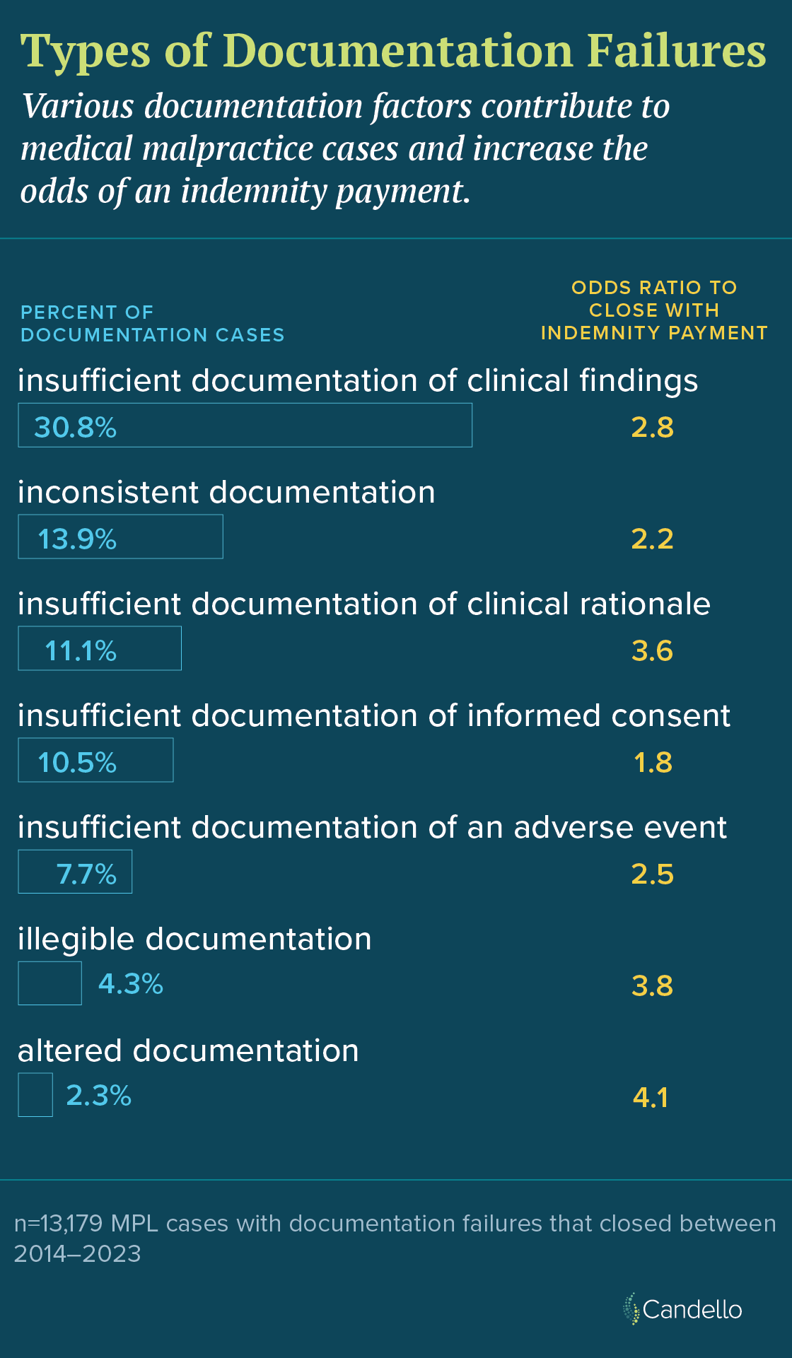 During the past decade, documentation failures played a part in 20 percent of closed medical professional liability (MPL) cases each year on average. Problems with the medical record led to 140 percent higher odds of case payout compared to cases without documentation issues. Furthermore, cases with documentation factor(s) involved greater clinical severity, with 50 percent involving high-severity injuries or death compared to 41 percent for cases without documentation issues.
