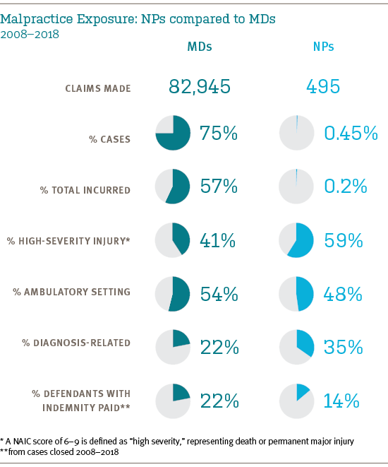 Approximately 270,000 advanced practice registered nurses (NPs) were practicing in United States as of 2016,¹ with those numbers expected to grow by more than 30% over the next decade.² In almost all states, NPs now practice independently—with prescription privileges and, often, hospital admitting privileges.³ Concurrent with expanding their roles, NPs are increasing their medical professional liability (MPL) exposure.